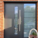 Das Design der Haustür in Gütersloh ist mit einem schmalen, vertikalen Fensterschlitz absichtlich schlicht gehalten und wartet als Besonderheit mit einem innenliegenden Schalengriff auf. Das Seitenteil links ist durch den Einsatz einer großen Fensterfläche und die Verwendung von Klarglas ebenfalls schlicht gehalten. Das Zusammenspiel von Tür und Haus ist absolut harmonisch ohne sich gegenseitig zu beschweren.